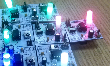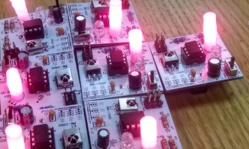At first, all the kits, are running through their own cycle of colors, but when you wave your hand over them, their light sensors cause them to all reset in unison